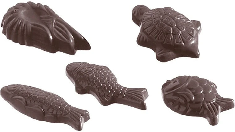 Profi- Schokoladenform/Pralinenform von Chocolate World®. Sehr langlebige Form aus stabilem, stoßfestem Polycarbonat. ++ Rahmengröße (mm) ++ 275 x 135 x 24 ++ Stückzahl ++ 4 x 7 / 5 Fig. ++ Abmessungen Nutzen (mm) ++ 38 x 20 x 7 ++ Stückgewicht (g) ++ 4,5 ++ Doppelform: ++ nein ++ Anmerkung: ++ Das Gewicht wurde auf der Grundlage von Vollmilch-Schokolade bestimmt und kann je nach Schokoladensorte, der Füllung sowie der Gießtechnik Abweichungen verzeichnen. ++